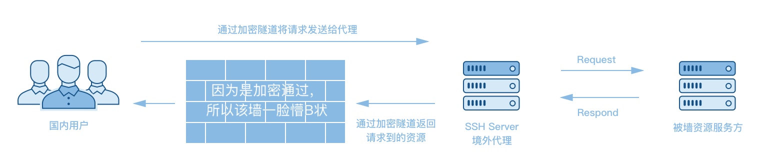 人们想到了绕过GFW的办法,那就是在境外搭建一个国内用户的代理,国内用户与代理之间建立加密的通道,由境外代理请求被墙的网络资源,再通过加密通道返回给国内用户。代理的类型也有多种,像HTTP、Socks、VPN、SSH等。以SSH隧道为例:
