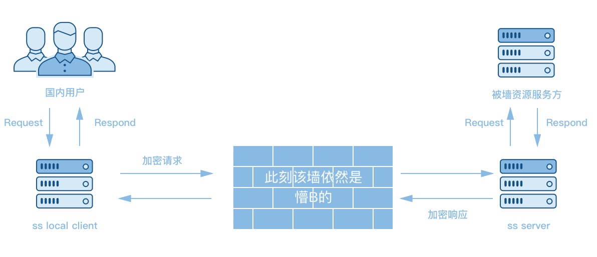 于是SS横空出世,分为客户端和服务端,确保经过GFW时是普通的TCP协议数据包,没有明显的特征,而且GFW也无法解密分析,从而实现绕墙访问资源。从技术上保证不会被和谐掉,安全性较高。
