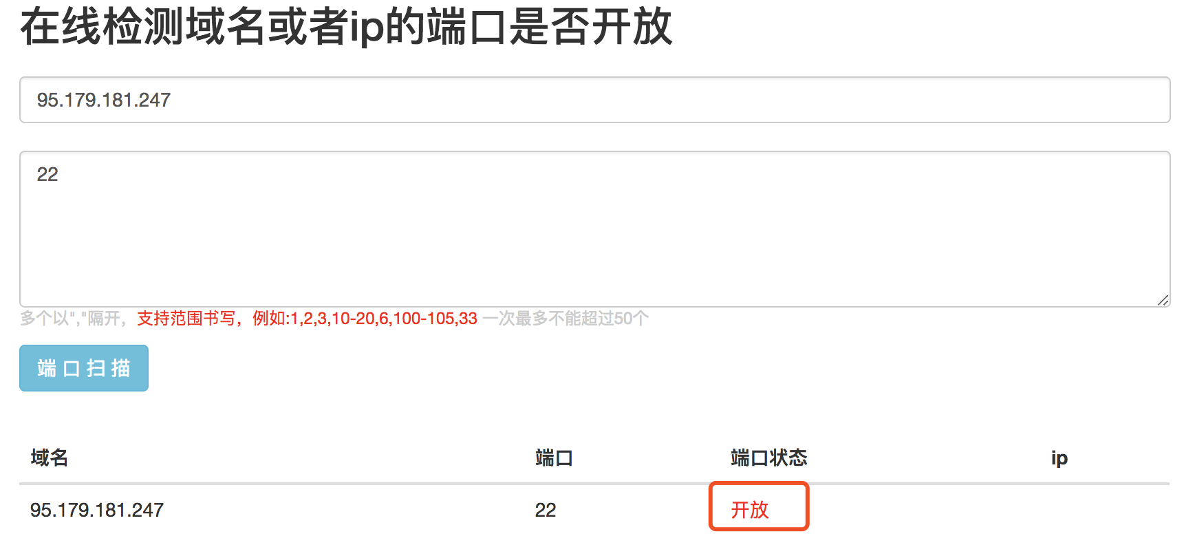 前往国内端口扫描站检测端口是否被封:SSH连接默认端口是22,只有当端口状态为开放时,该IP没有被封,可用。如果状态为关闭,重复3.1 创建服务器。