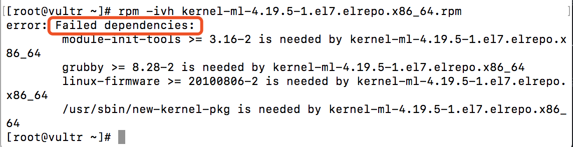 rpm -ivh kernel-ml-5.0.5-1.el7.elrepo.x86_64.rpm # 出现依赖错误,一直没找到解决办法,就转CentOS7了